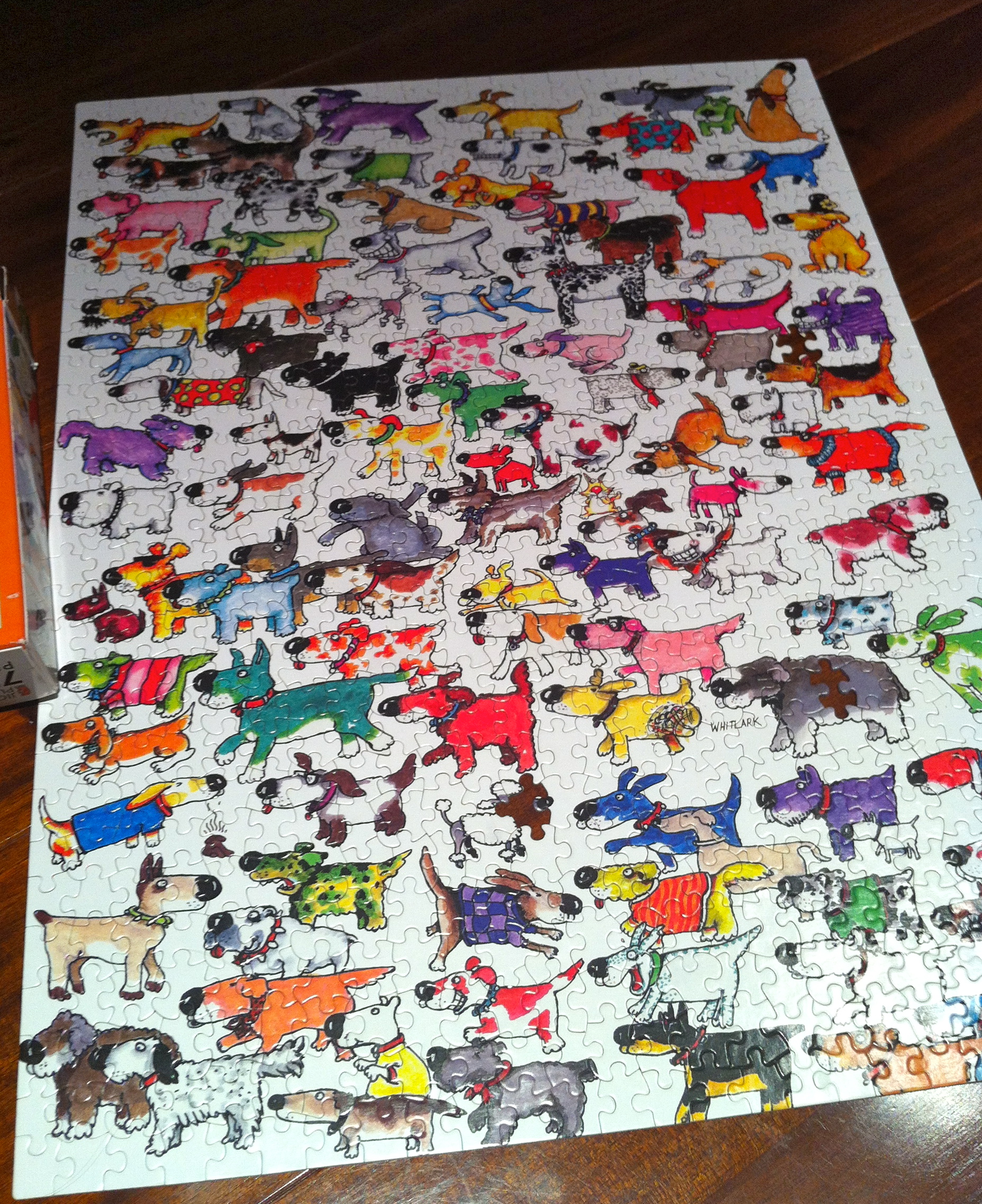 This week I opened a small puzzle (750 pieces), just enough to keep me busy in off times for a couple days. My family helped out, but mostly it was me spending hours staring at the cartoon drawing of One Hundred Dogs and a Cat. I was about two-thirds to puzzle completion when I got the sneaking suspicion that there might be pieces missing. I had my kids scour the floor for missing pieces. They couldn’t find any. Knowing all too well how not thorough they are in the “looking” department, I too crawled around on the hard wood floor under the dining table. Twice. Nothing.