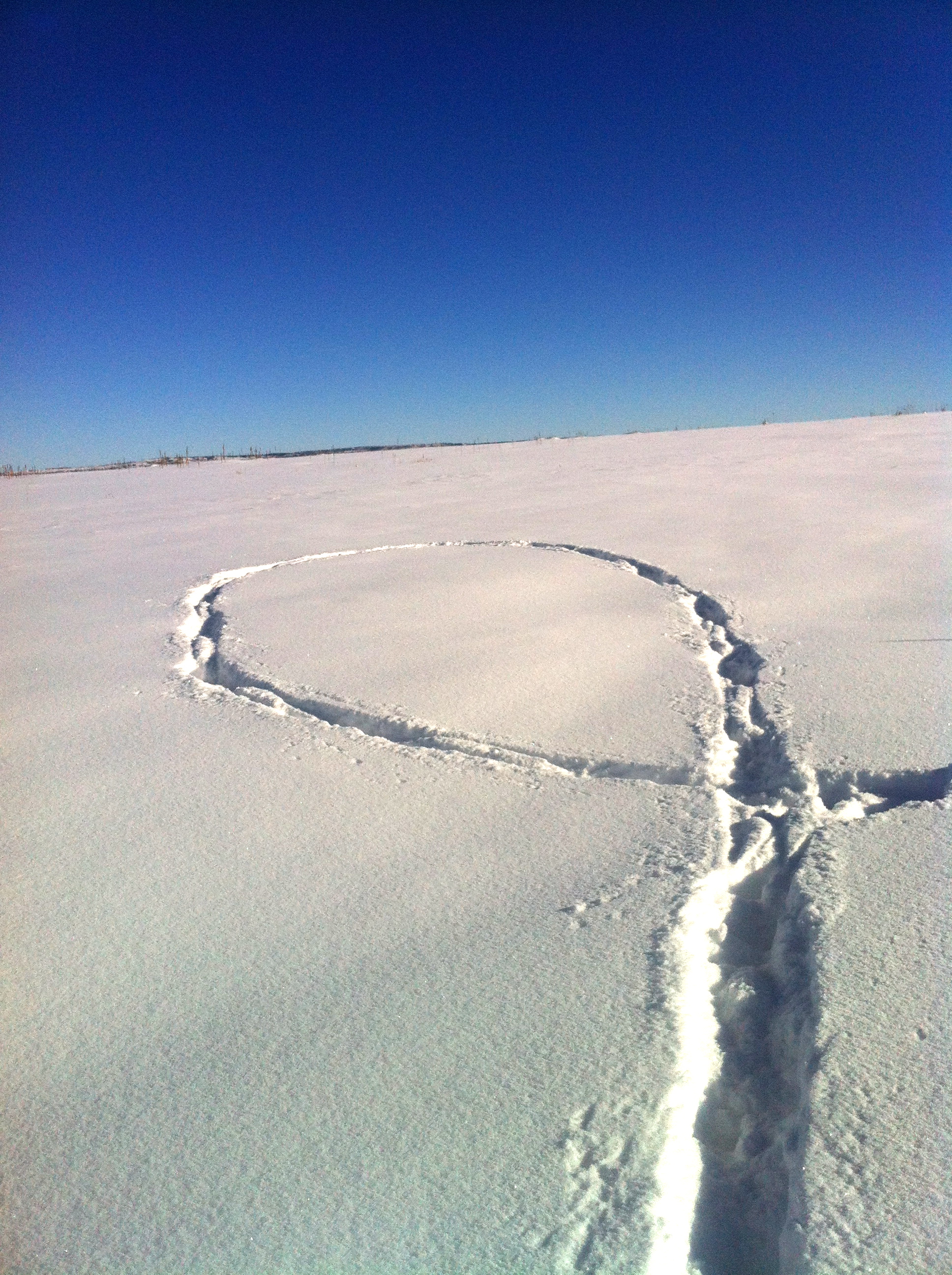 As we hiked along together, I noticed that Ruby kept making loops in the pristine snow. She would run out away from us, turn, run back toward us, and complete her loop. She did this over and over and over. Large loops. Small loops. Skinny loops. Fat loops. Nearly each time she would take off she would return and cross over her starting point to close her loop. She was systematic. Someone walking along after us would have to wonder at her repetitive, circular art, her snowy crop circles.