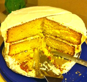So, last night, I greased and floured two 9″ round cake pans. I sifted my flour. Then I sifted it again with the baking soda and salt. I creamed butter and sugar for so long I thought I’d kill my 16-year old Sunbeam Mixer. It was only then that I realized my kids had finished off the milk I needed. Into the car, down to King Soopers at 8 p.m. to fetch milk, all the while ever so grateful that my scratch cake didn’t require me to milk a cow. As I was folding in my beaten egg whites, I was apprehensive. I didn’t like how it was going, but I persevered. At 8:20 I popped two round cake pans into my oven, flipped the oven light on, set the timer for 25 minutes. My hopes were elevated slightly when I saw the outer edges cooking. I paced like an expectant father as the cakes began to rise. When the timer went off and I needed to check the doneness, I cleared the room so a sonic boom from my noisy children would not ruin my effort. I lifted them from the oven as I had carried my first born, full of hope and wonder. As they released from the pans, I stood in awe. In front of me were two seemingly fluffy and light yellow cakes.
