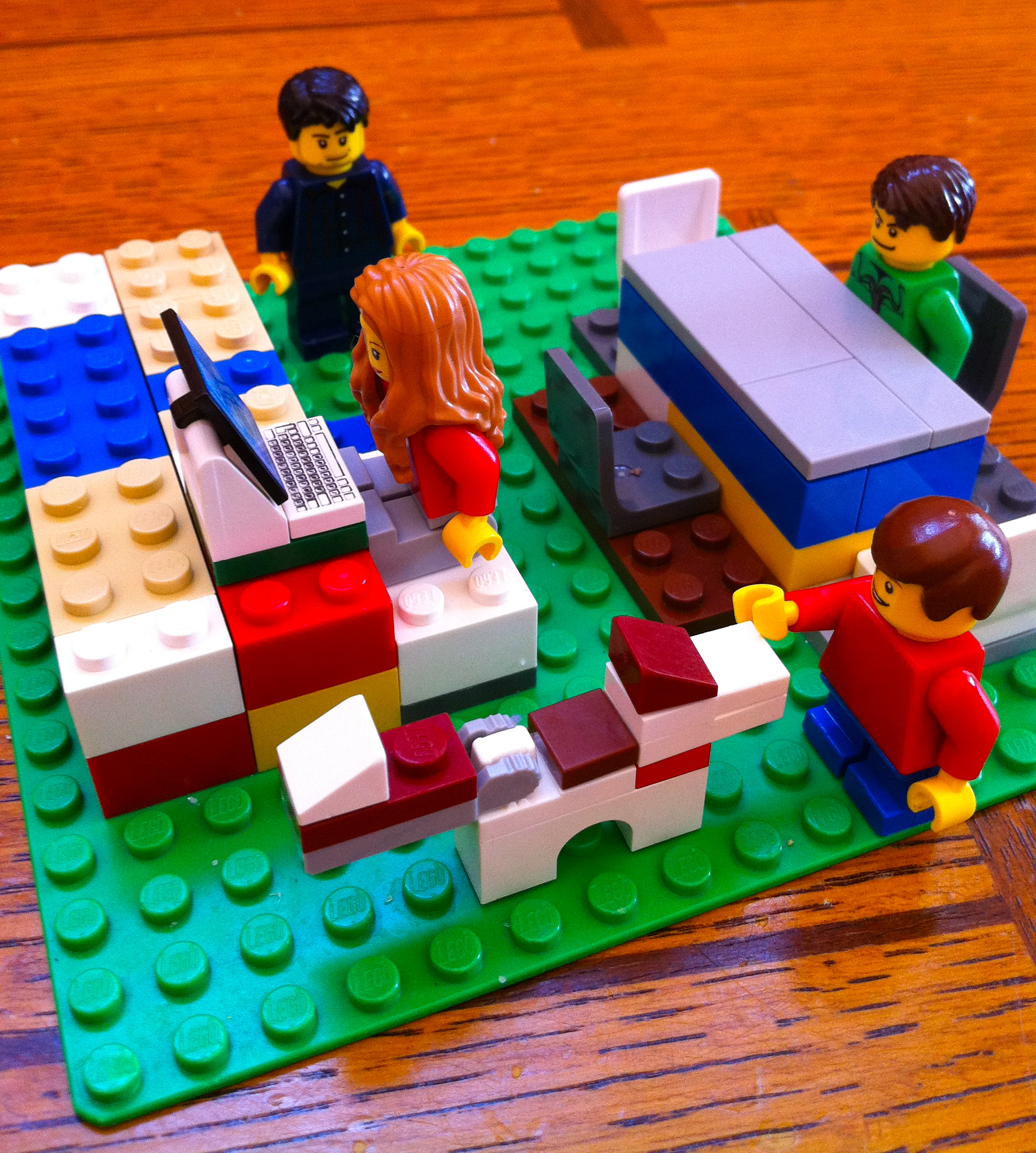 Joe does not have Luke’s gift for Legos. He has built sets, mostly with Luke’s help, but he’s not the Lego visionary that Luke is. He wants to be, but he’s not there yet. Or so I thought. Yesterday, however, I was sitting at the counter working on my computer when Joe brought up a Lego creation. It was a representation of our family, each of us in our own likeness, as if we were gathered together in our dining area. Lego Joe was sitting at the table wearing his favorite green fleece jacket. Lego Steve was standing there looking dashing, a perfect representation minus the salt and pepper needed for his plastic hair. Lego Luke was petting Lego Ruby, who was the spitting image of her doggie self down to her reddish-brown and white border collie markings and her red collar. Then, there was Lego Justine. I had the long, blonde hair, the grey yoga pants, and the lipsticked lips. Looked like me all right. Then I noticed that Joe had me with my back turned to my family as I typed away on my computer. Ouch.