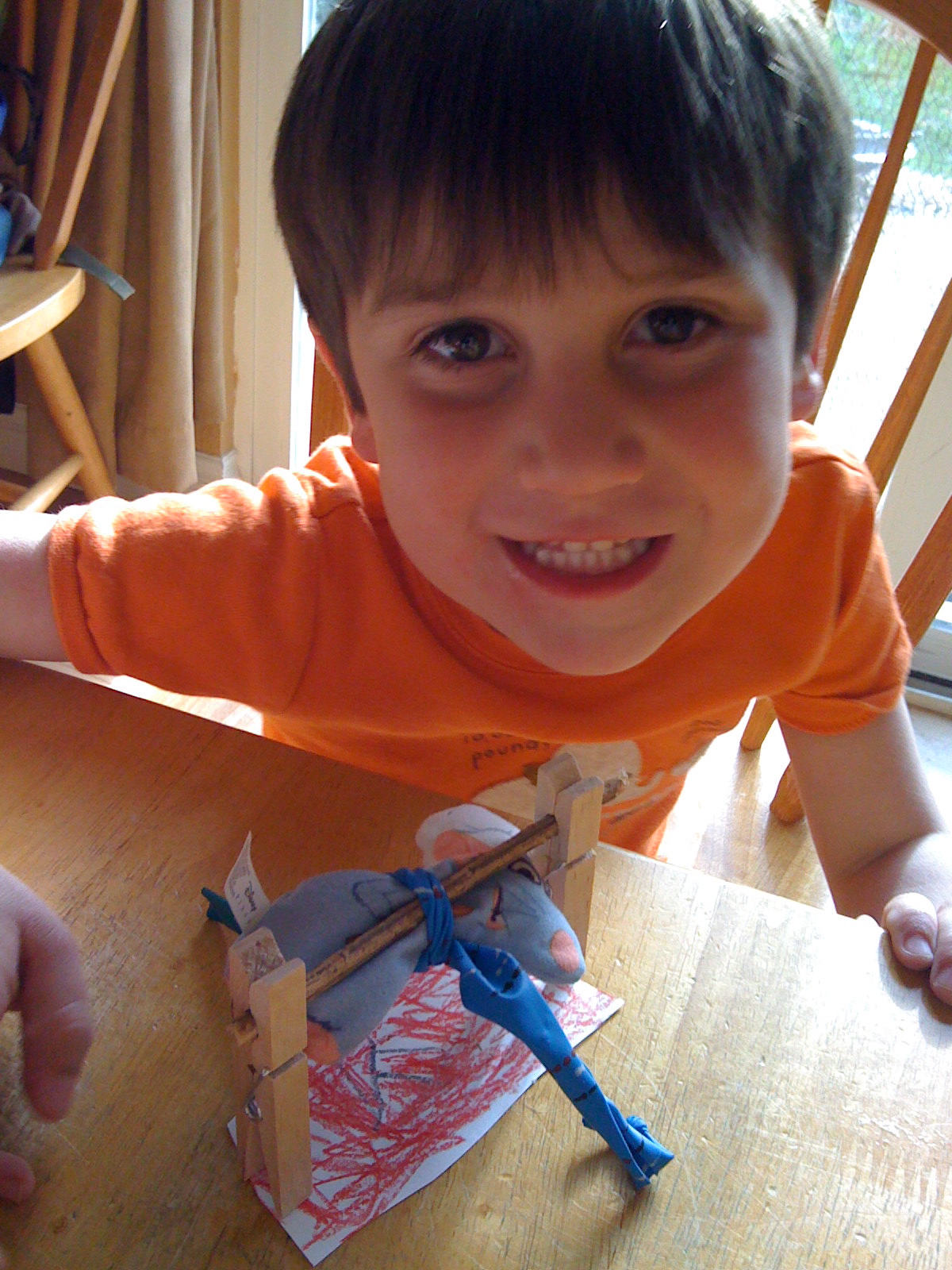 May 8, 2009 – I heard Luke taunting Joe saying, “I’m gonna cook your mouse.” Joe had just gotten a stuffed mouse from a prize box at school. I told Luke to knock it off and stop teasing his brother. A while later, I hear Luke say, “Joe…I’m cooking your mouse.” So, I turn around to tell him to stop with this “cooking” talk only to find Luke at the table, Joe’s stuffed mouse tied to a stick from the yard, the stick stuck between two upright clothespins, and a paper drawing of fire underneath him. He was roasting Ratatouille on a spit, just like he said he would. He’s a creative kid. Scary, but creative.