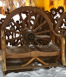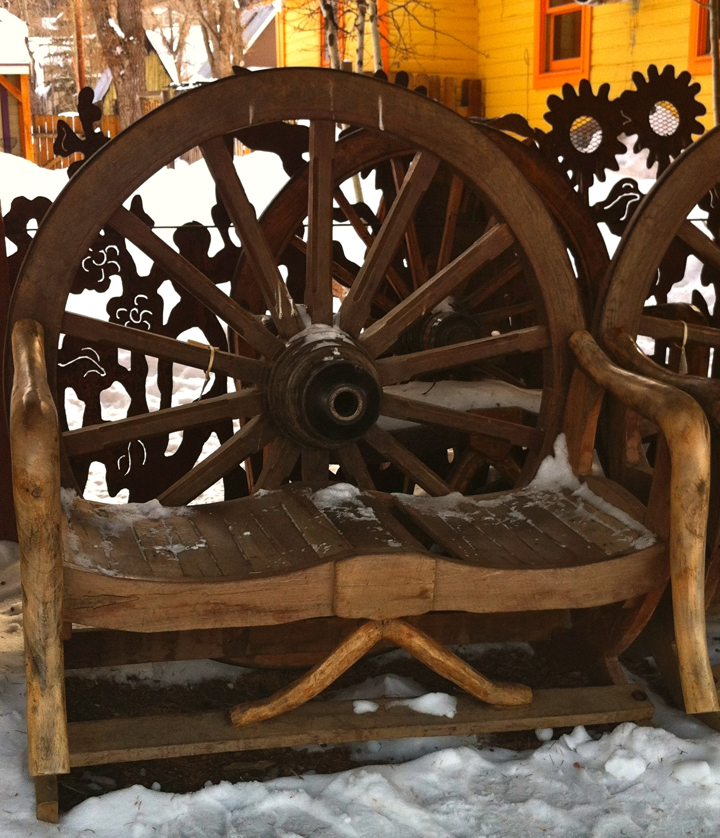 Hubby and I escaped to Crested Butte this weekend with some friends. The plan…no kids, two days of skiing, uninterrupted meals with alcoholic beverages, and a king-size suite with mountain view. We got here early this afternoon. First stop, the Brick Oven for pizza and beer. It was 2 p.m. Yes. I had a beer at 2 p.m. It was glorious. After lunch, we strolled around downtown Crested Butte (population: about 1500 crazy, skiing folks), checking out the restaurants and stores. As we were heading back up Elk Street, I saw something that stopped me dead in my tracks. You can’t be serious. Right there, just feet from the sidewalk, were two benches made out of wagon wheels. Wagon wheels have been a personal joke between Steve and I since the day he decided to install a whiskey barrel into our otherwise extremely natural and tastefully landscaped backyard. I told him that with that whiskey barrel we had officially arrived at one wagon wheel shy of white trash.