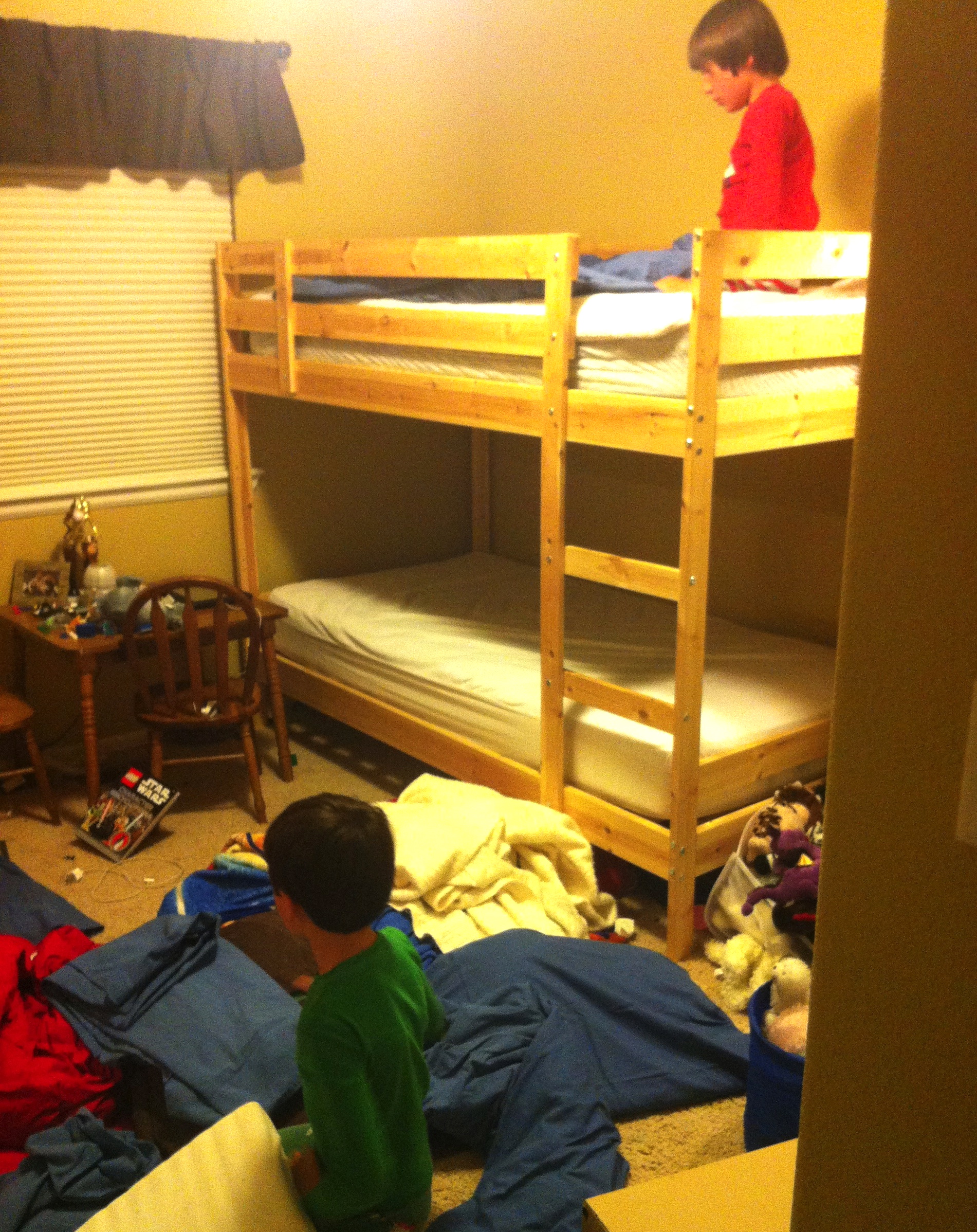 I got out the regular cotton sheets for their beds, tossed them at the boys, and told them to get busy making their beds before I stomped out of the room. Five minutes later I went back to check on them, and they were still clueless. Nothing in the room had changed. I’ve shown my boys repeatedly how to change their sheets, but clearly they have not been paying attention. So, I stood over them barking directions, trying to get them to finish their own task. They labored mightily. They could not get it together. About 9:45 when the beds still weren’t ready for sleep, I decided the quickest path to rest for all of us was for me to take over. So I did. I finished what they had started and we were all asleep by 10:30. I knew that doing their work for them only encourages them to call me to fix their problems, but I was too tired to care.