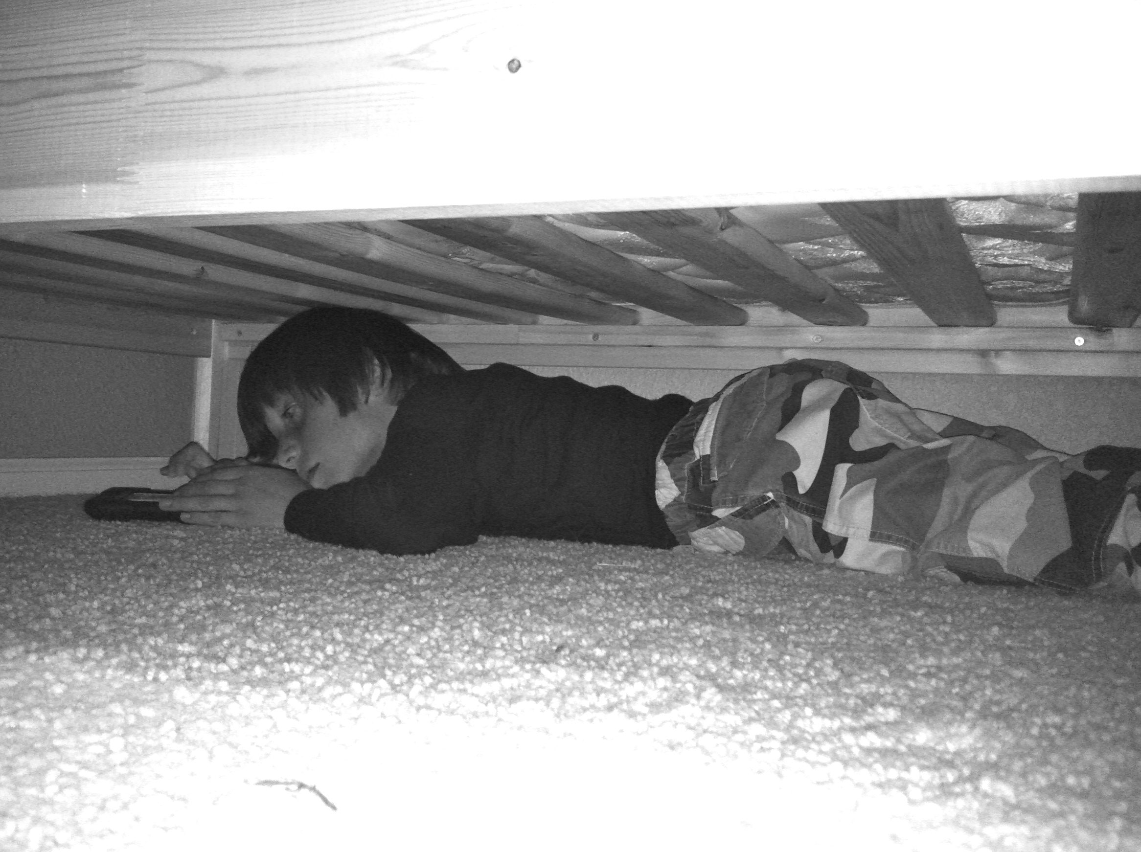 I went upstairs into their room and Joe was not on his bed. I called his name. A noise emanated from under the bed. Yep. My nearly 11 year old son, livid at his unwavering mother, had crawled under the bunk bed in protest. I laughed to myself and then got flat on my belly next to the bed to confront him.