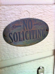 Wow. I thought that was pretty bold of Steve to say, even though it was fairly likely true. Our neighborhood has a strict no-solicitation policy. It is posted at the front entrance on the main thoroughfare. Any business solicitor who is in our neighborhood must have a permit obtained from the City of Littleton and must be able to provide a copy of it for homeowners if asked. If not, they are not legally allowed to go door-to-door in our neighborhood. Lots of neighborhoods and cities have these types of laws, but not many people are aware of them. Thanks to our overzealous community members who get annoyed about every single little thing (not kidding…one woman managed to get hot air balloons banned from flying over our neighborhood from the state park across the road), we know about this law. This law does not actually mean anything because salespeople still approach our doorstep non-stop and our only recourse is to file a complaint about them, but at least when they show up we have a nice way to explain why we’re closing the door in their face.