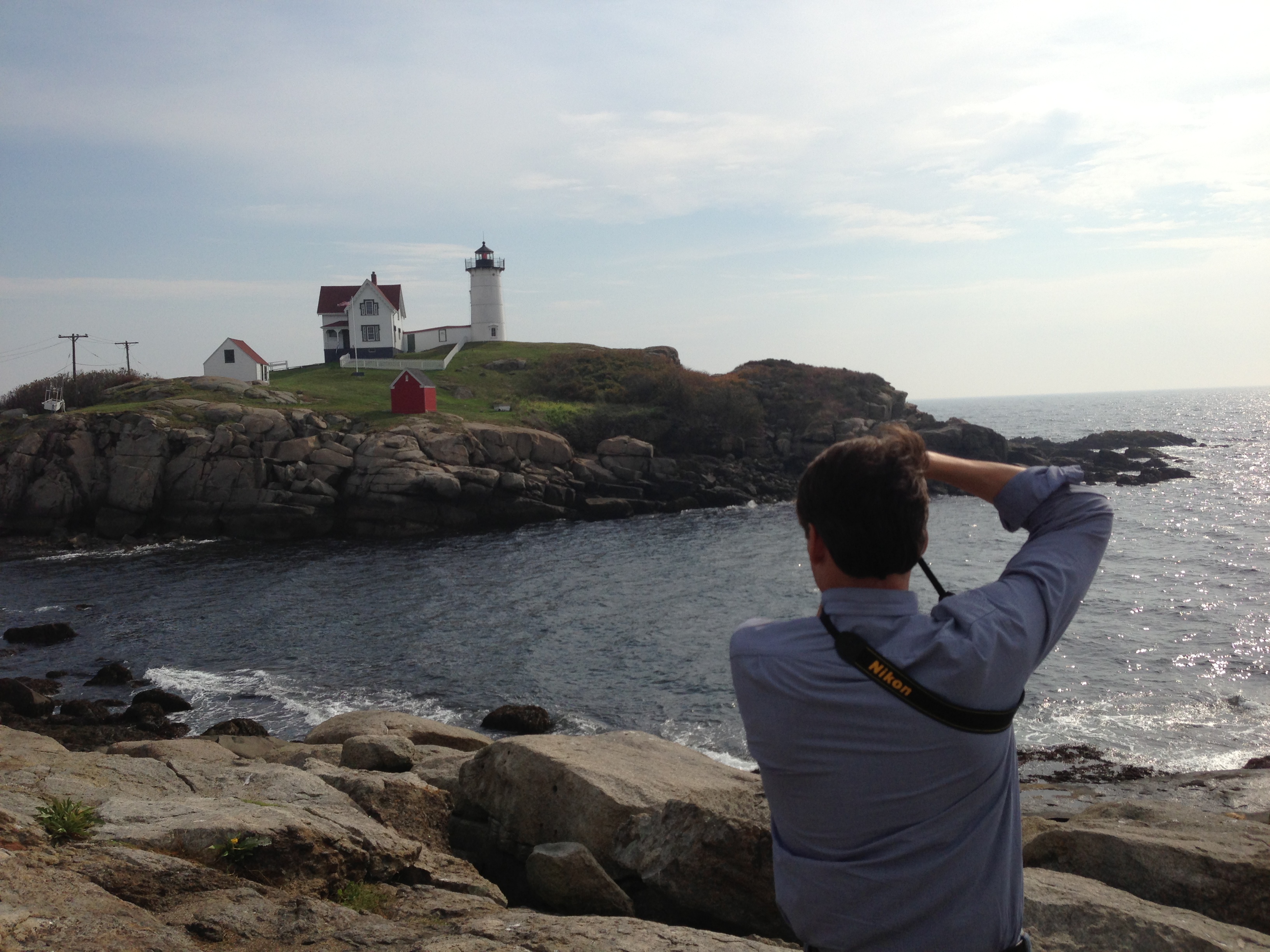 Next stop was the Nubble Lighthouse. The lighthouse sits on an island just offshore. It was a perfect 65 degrees and sunny. A wedding party arrived for someone else’s big day. I took a photo of Steve taking a photo. I have a lot of those.
