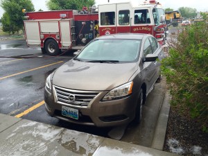 Fire personnel were hosing off the sidewalks and parking lot, leading us to discern that the bull left a bloody trail before succumbing to his fatal wounds. The officer gave us a business card with his name and a case number, and we headed back inside to figure out how we’d be paying for the damage to the car. Steve waives insurance coverage every time we rent a car, citing that our credit card will insure us if necessary. I guess we’ll find out soon enough if that is true. In the meantime, we finish our trip here with a big, old bull-dent in the hood of our Nissan Sentra. And to think we’d fretted about the little paint scrape over the gas tank when we conducted the vehicle once-over before driving off the Alamo lot.