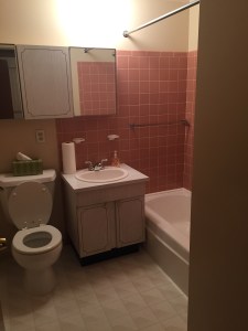 Slightly outdatedIn between the bigger renovations, I have painted nearly the entire main floor, including ceilings. I figure that by the time we move in, I will have painted approximately 3,000 square feet. I am SO done with painting. On the plus side, my painting skills are currently Level Expert. So I am ready to move on and tile again, which is perfect because our small, dated master bath is our next major undertaking. I am ecstatic to report that the main floor bath is nearly complete. You may remember our hideous main bath. All terra cotta-colored, square tile and sixties panache. Fairly certain the only thing that had been updated in that room in fifty years was the sink faucet and maybe the sink itself. I imagine it was once also orange hued like the walls. Well…it’s all gone.