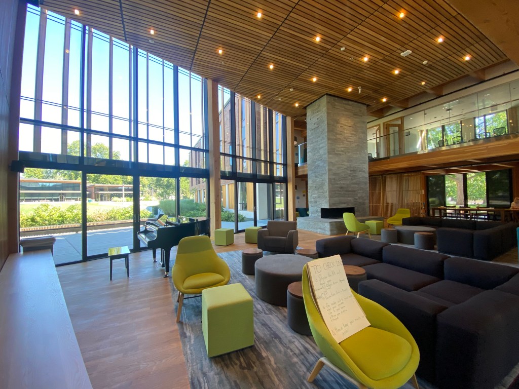 I knew the dorm was posh. It is directly across a lawn from the dorm Joe was in over the spring semester and right next to the dining hall, which was also built in 2018 and deserves its own post with its coffee house, sushi chefs, and wood-fired pizza oven. Joe had us watch a YouTube video about his hall before he headed back to school, so I was well aware what would await us when we walked in the doors with Joe’s belongings. Still, it was something else stepping inside the building.