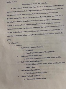 Dune by Frank Herbert is Thing Two’s favorite book. And he has read a lot of books. He counts Don Quixote, all 800+ pages of it, another of his favorites. When he saw they were making another movie about Dune, he was excited. He has waited a long time for this. He was worried that the film maker wouldn’t do the book justice. But, he wanted to share his love of this story with us, so in preparation for watching the film he made us a four-page synopsis and outline about the novel, the characters, the major themes, and the family houses. We watched part of the film last night and then finished it tonight, so he had time to pause the movie and tell us what was important to note and to explain things we were confused about. He is a science-fiction geek, who is obsessed with world building, Star Wars, and Legos. He is also a science, history, reading nerd who loves ships.