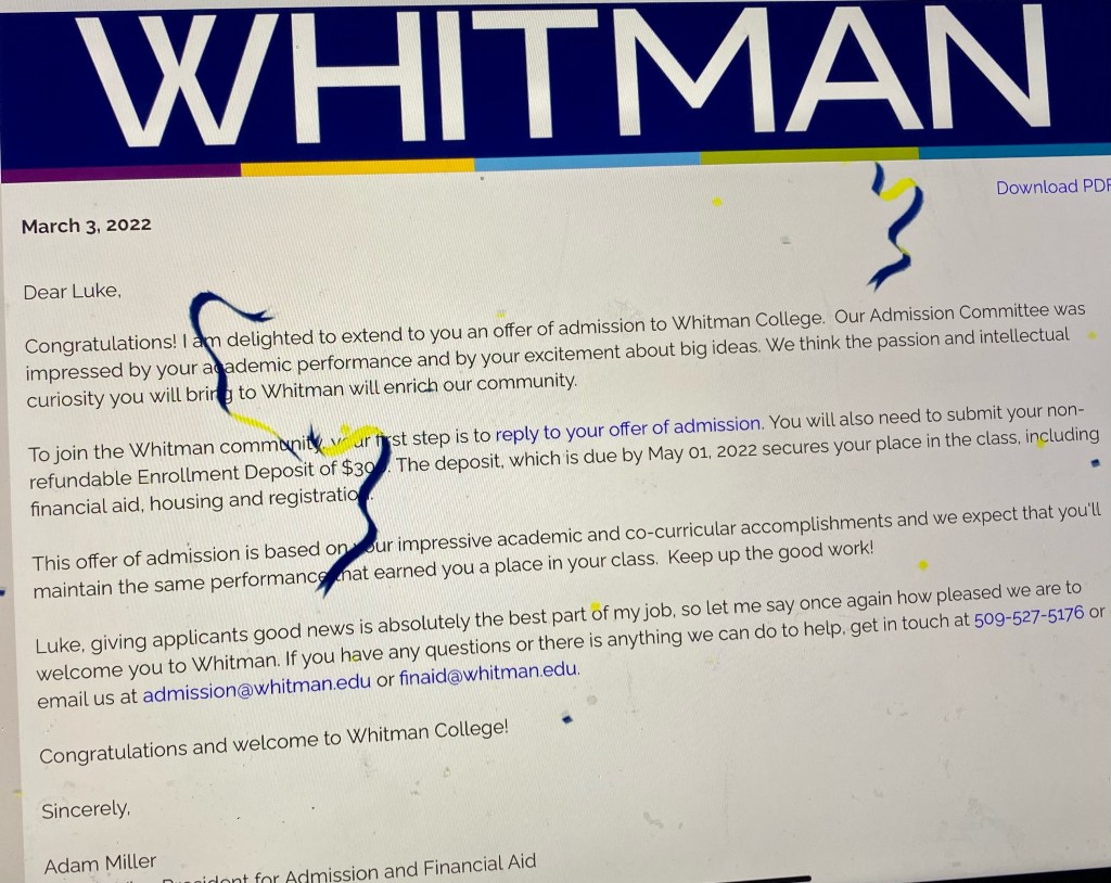 Well, it’s a done deal. After flying to three different states, touring five schools, revisiting two of the schools, and receiving four acceptance letters, Luke has chosen his college. It was a tough decision for him. He got a sizable merit scholarship from St. Olaf in Northfield, Minnesota, but ultimately decided he didn’t want to be Minnesota-level cold. He received a similar scholarship from the University of Denver, but decided he couldn’t go to college two miles from his high school because that wasn’t enough of a stretch. That left Reed College in Portland, Oregon, and Whitman College in Walla Walla, Washington, pulling his attention.