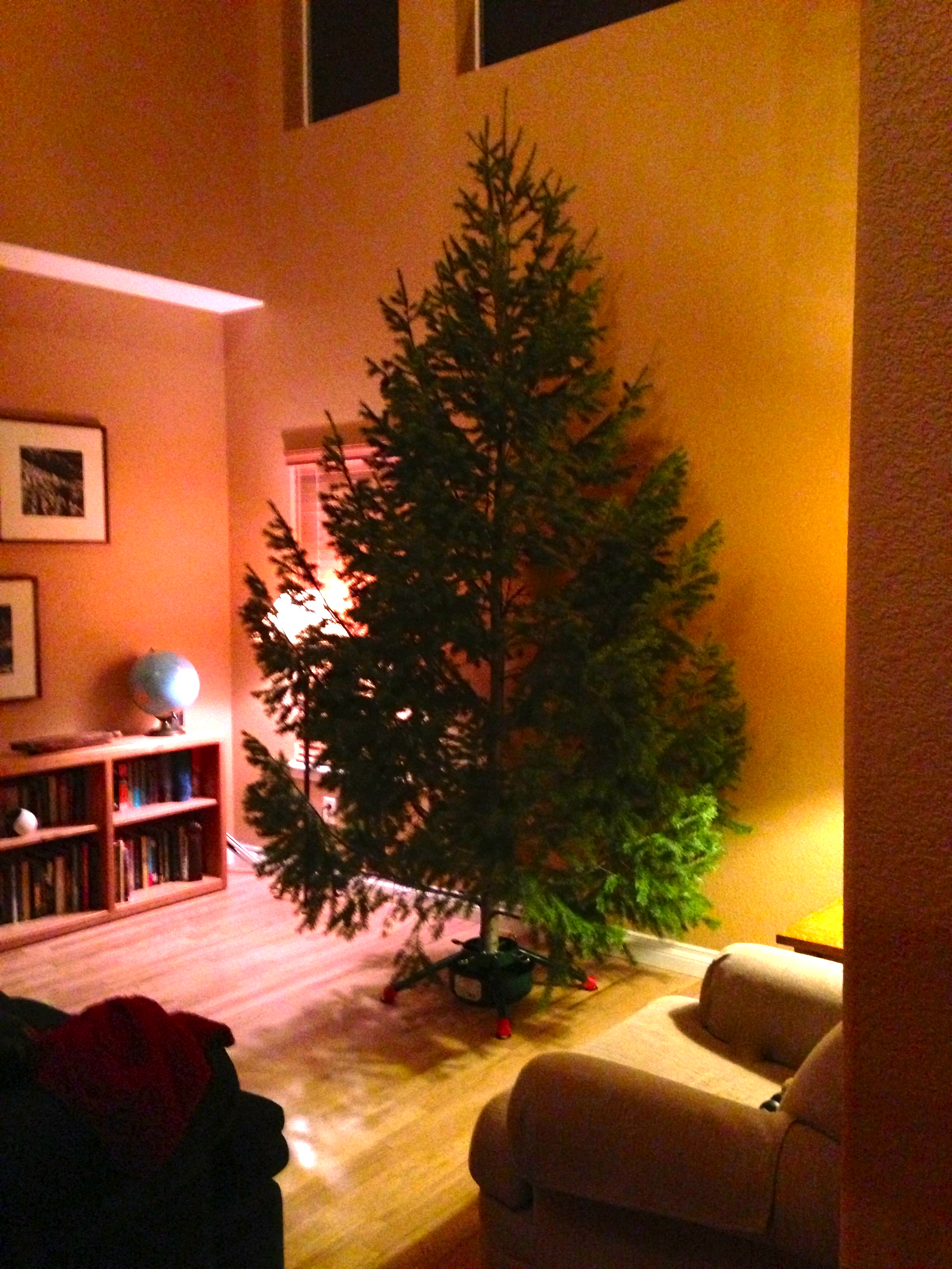 Then, we got the tree home and off the trailer. That was when we started to suspect that we might have a problem. You know how sometimes you take more food than you’re actually going to be able to eat because your eyes are bigger than your stomach is? Well, I began to wonder if we’d had similar problems sizing up this forest tree to the realistic size of our living room. We leaned it up against the house. It was huge. I told Steve that, ala one of my favorite scenes from Christmas Vacation, someone was going to ask us where we thought we would put a tree that big. We got out the tape measure. It was 15 feet tall. While a 15 foot tree can easily fit in our living room with the 18 foot ceiling, it cannot fit in a tree stand that can only support a 12 foot tree. Steve cut off a few more feet while I walked around muttering, “little full, lot of sap.” With that last cut, however, we found that now the bottom appeared sparse and uneven so we omitted a couple extra feet to balance it out. Voilà.