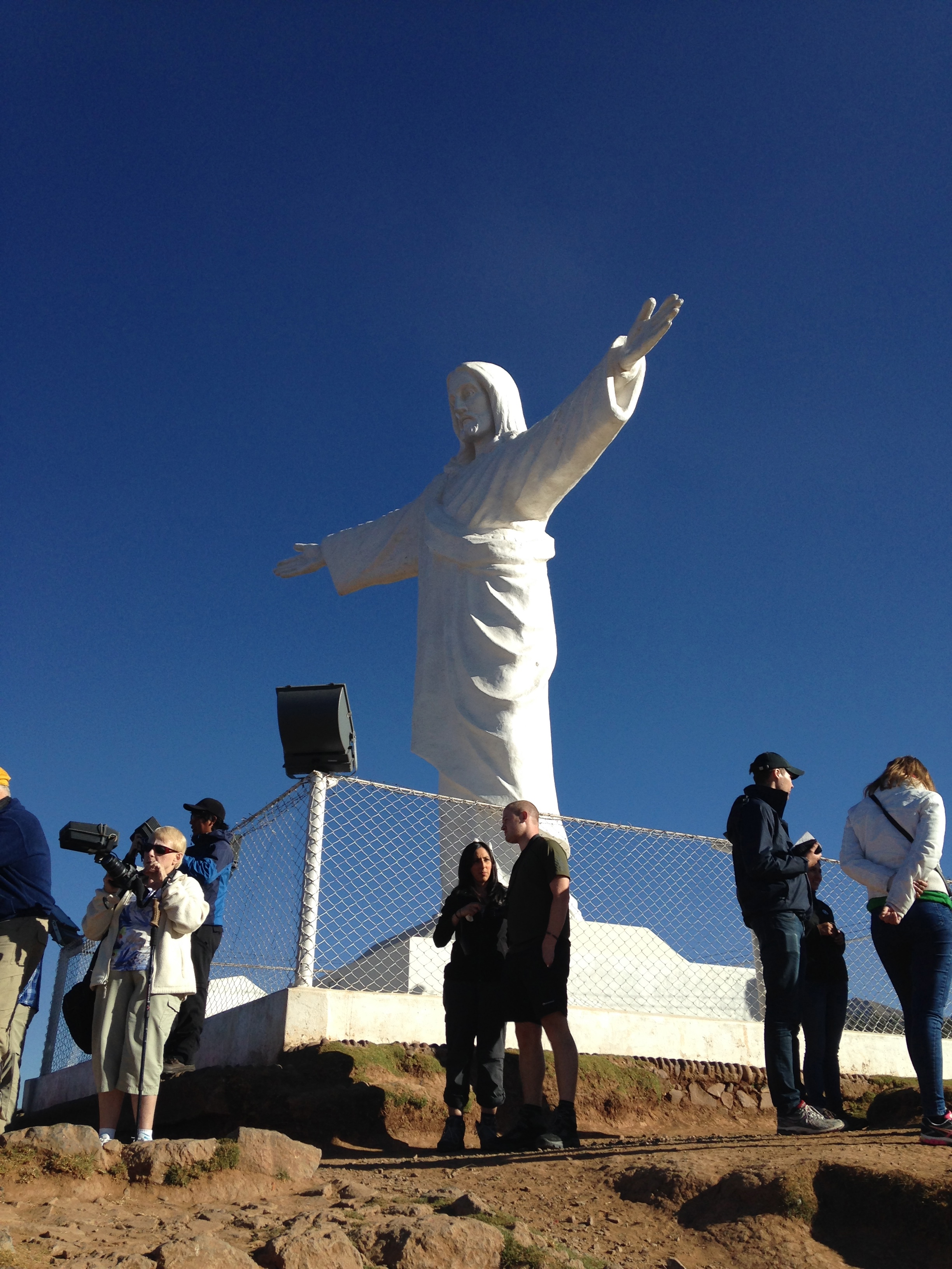 We started our day in a van around 7:30 a.m. We had a busy day planned, so we got right to it. Our first destination was a statue that sits high above Cusco. Ray called it “White Jesus,” but it is officially called Cristo Blanco. The statue was a thank you gift from some Christian Palestinians in the mid-1940s after they sought refuge in Peru. Considering that we were about to take a tour of the Sacred Valley of the Incas, it seemed a little strange to be hanging out by a white Jesus but the view was worth it. From there, we were also able to get a glimpse of our first Inca ruin, Sacsayhuaman. Ray told us the correct pronunciation for that word. Then he told us most gringos call it “Sexy Woman,” and that stuck. Go figure.