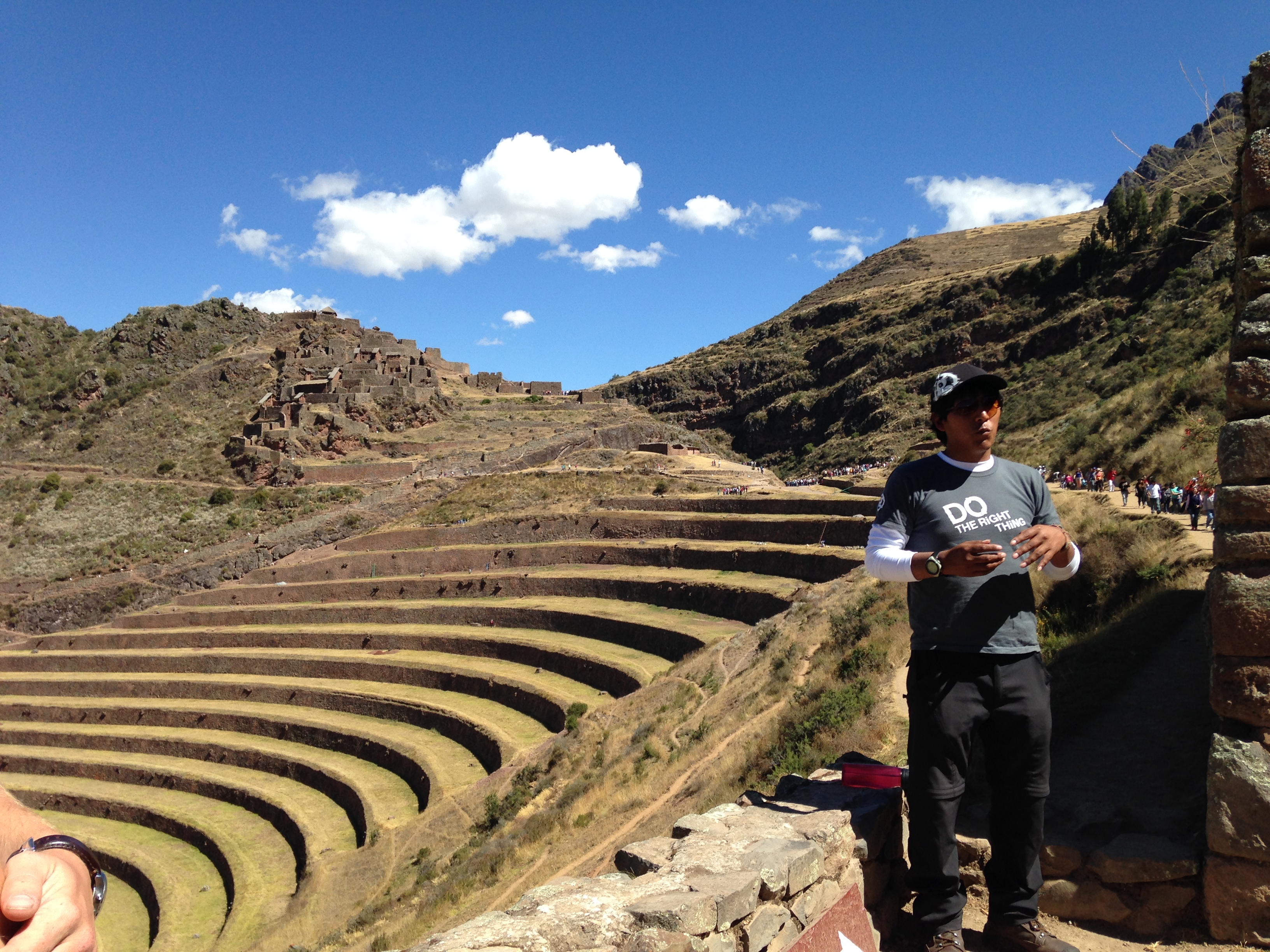 Our next stop was to Pisac to tour our first Inca ruin. As we pulled up, we could see the agricultural terracing the Incas had set up. It was my first opportunity to acknowledge that we were actually in Peru and about to experience something I’d only seen in photos. I felt so small in the expanse and could not wait to stand there in the midst of what the Incas had created. Once we negotiated the maze of tour buses and finally reached the entrance, Ray took over. He told us how the terracing allowed the Incas to grow diverse crops depending upon the altitude at which they were planted. The Incas were not only master builders, but they were masters of their environment as well, creating channels and rerouting snow melt water to irrigate their crops from the top down. We toured the ruins and got some practice huffing and puffing our way up the stairs. Ray told us he was going to be evaluating our group fitness. As the oldest person in our group, I crossed my fingers that I would not turn out to be the weakest link.