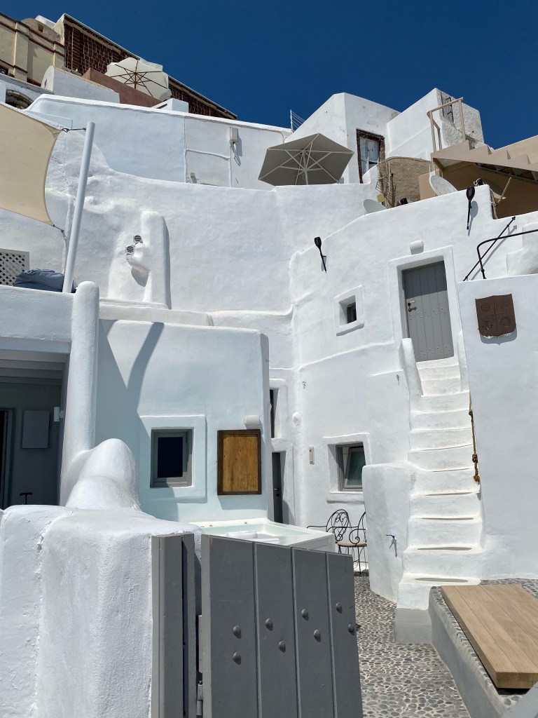 Our first stop was Oia. The English pronunciation of this village name is Oy-a, but the Greek pronunciation is Ee-a. Either way you say it, nothing can prepare you for what awaits you when you arrive. All the photos you have seen pale by comparison. The white buildings provide a stark contrast to the sea below. The outer streets of Oia village (although it’s hard to call them streets when there are no cars) are lined with restaurants and shops. We found shop after shop with Greek ceramics, clothing, and artwork, along with the requisite touristy shops with more standard souvenirs. The Greeks are open to some respectful bargaining if you want to try it out.