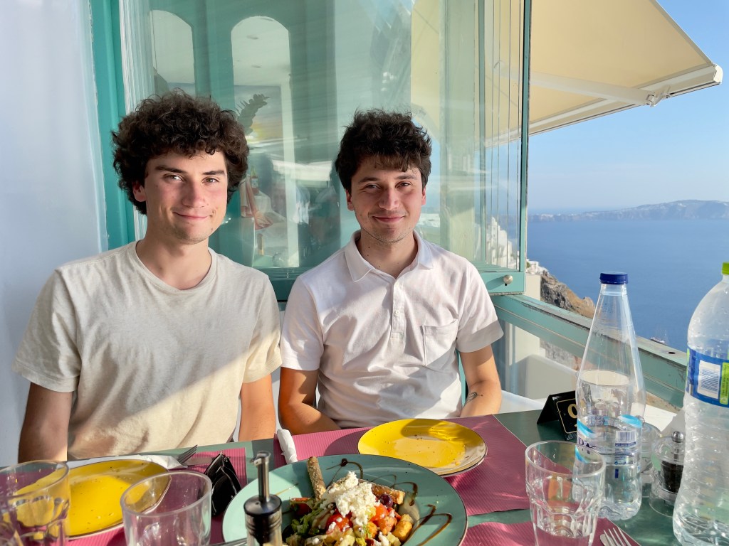 Once she got us settled with beverages, she came to take our orders. As you can imagine, most Greek dishes sound Greek to us, and Luke was the first victim who had to order. He ordered traditional Greek Moussaka but, unfortunately for him, he pronounced it “MU-sa-ka.” She pretended she didn’t understand what he said, which made him repeat the mispronunciation. She looked at him and said “mu-SA-ka.” Then she gestured for him to repeat it. Terrified, he paused, and then correctly repeated after her, which earned him a kudos from her. When it was Joe’s turn to order, he wisely said, “I’ll have what he’s having.” She had a great laugh over that. All three of my companions ordered the Moussaka, while I tried a Greek pizza that came recommended. Steve and I shared a Santorini salad, which is a decidedly better version of a Greek salad you might find in the US, if you love capers, which we do. When the server came to clear our plates, she looked at Luke and asked if he enjoyed his….she paused to give him the opportunity to pronounce it correctly. He looked at her, laughed, and affirmed he did and left it at that.
