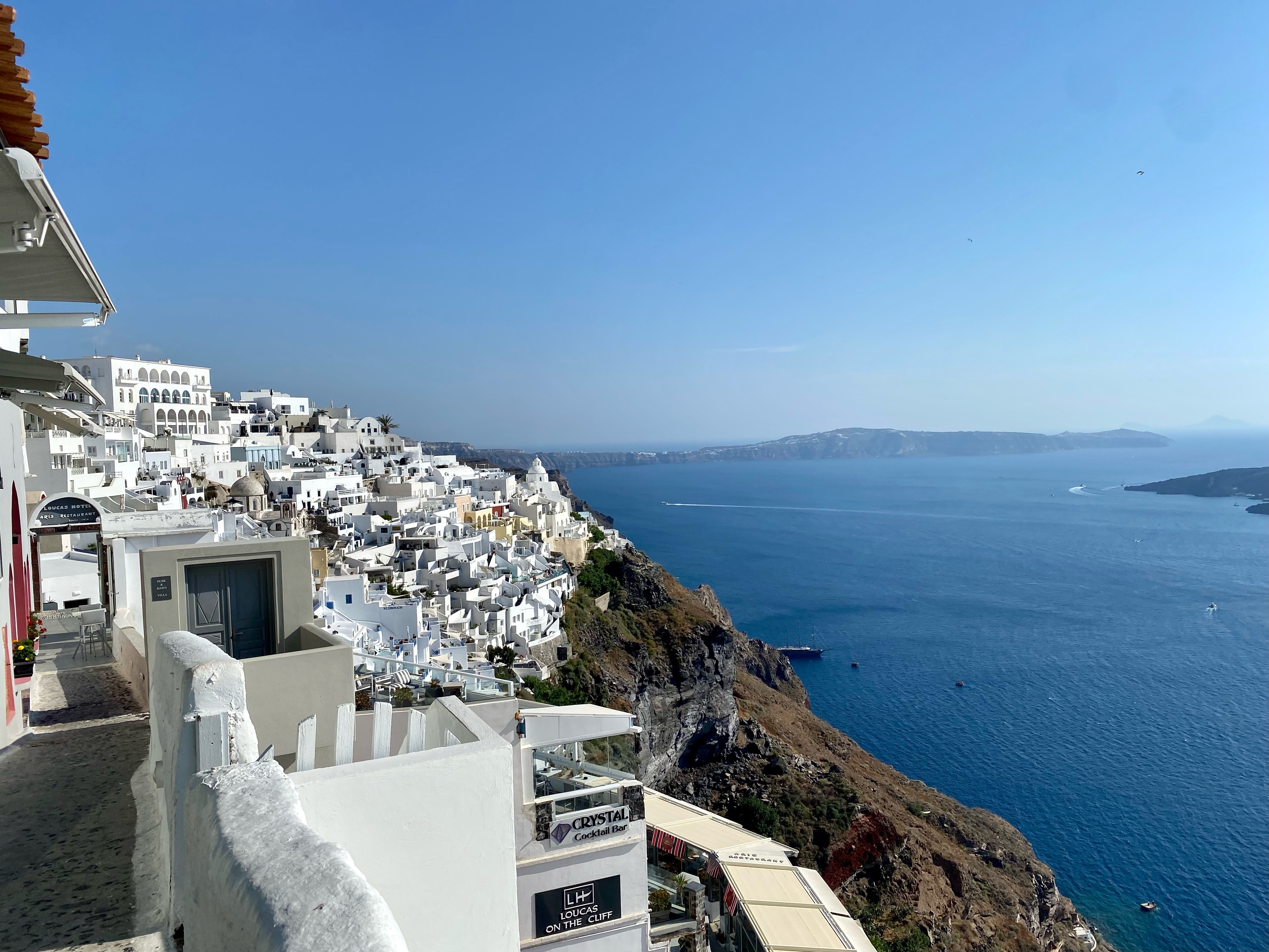 After finishing our wine samples and devouring our snacks, we headed to Fira, Oia’s big sister. Oia is the sleepier of the two main cities people visit on the island. While she has her fair share of shops and restaurants, it’s Fira that is known for nightlife. We were only there for the day, so nightlife was not on our radar, but shopping and food were. Fira, like Oia, is comprised of carless walkways meandering up and down in between plentiful shops and restaurants. So many choices and so many stairs! We were grateful it wasn’t raining because those cobbled walkways and stairs would be a slippery nightmare in the wet. Luckily for us, it was a sunny, warm day with not a drop of rain in sight. Welcome to summer in Greece.