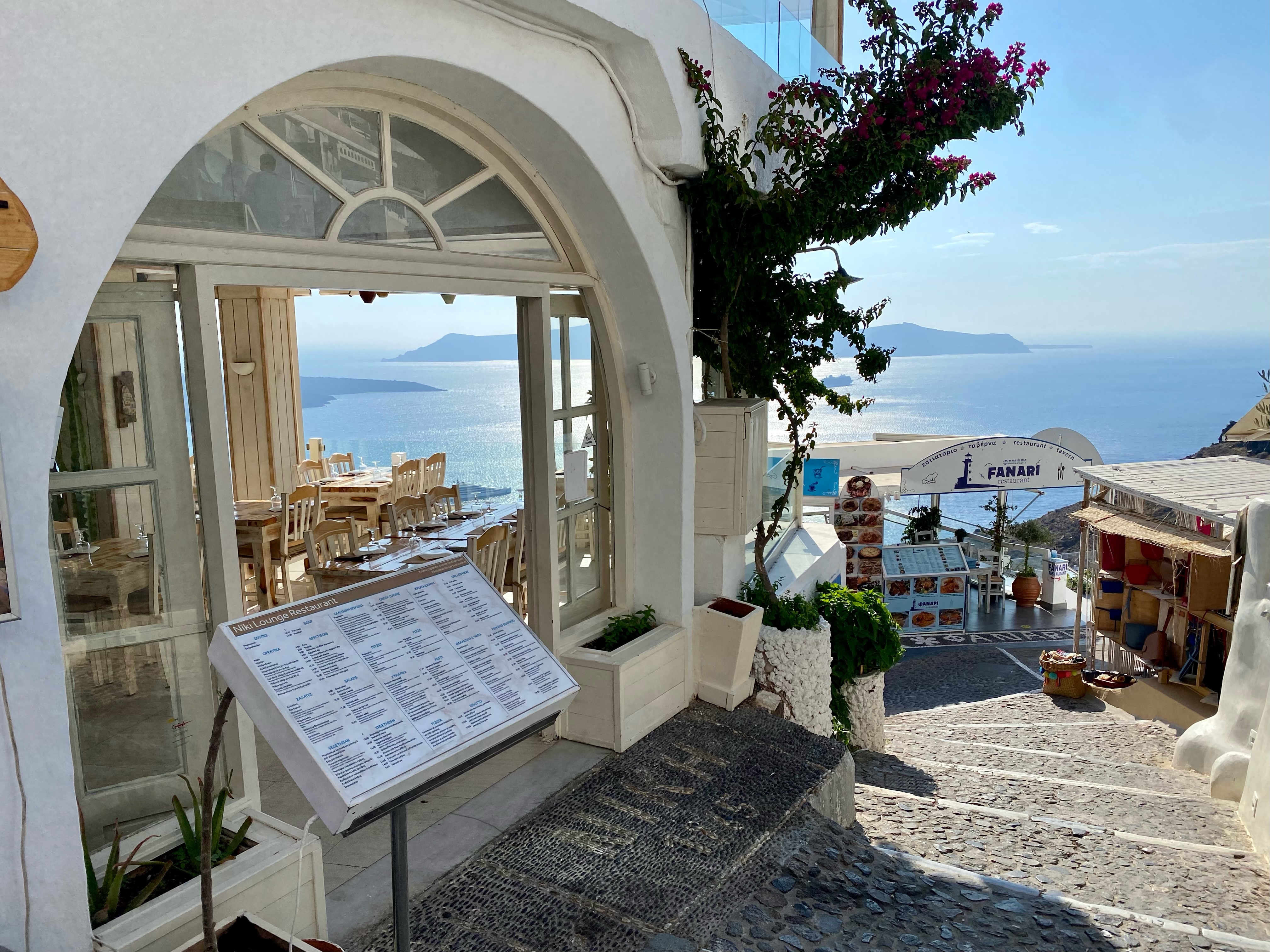 Our first stop was Oia. The English pronunciation of this village name is Oy-a, but the Greek pronunciation is Ee-a. Either way you say it, nothing can prepare you for what awaits you when you arrive. All the photos you have seen pale by comparison. The white buildings provide a stark contrast to the sea below. The outer streets of Oia village (although it’s hard to call them streets when there are no cars) are lined with restaurants and shops. We found shop after shop with Greek ceramics, clothing, and artwork, along with the requisite touristy shops with more standard souvenirs. The Greeks are open to some respectful bargaining if you want to try it out.
