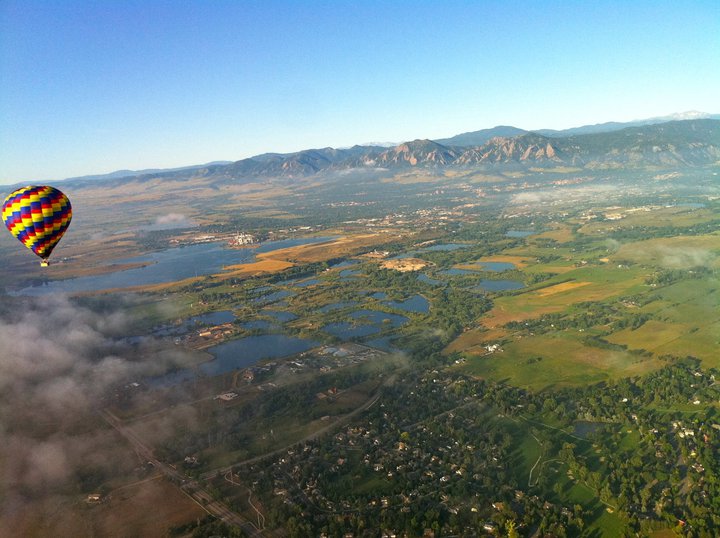 Boulder and the Flatirons from a hot air balloon
