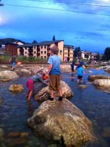We’ve had a great vacation up at our home-away-from-home with our dear friends. And, after numerous activities that cost us more money than I’d care to admit, I asked the boys what part of our trip was their favorite. Turns out they had the most fun tonight. We were at the base of the Steamboat ski resort. They weren’t doing the ropes course or riding the gondola or taming the mechanical bull. They weren’t even necessarily enjoying the free concert we’d come to attend. They were simply running around like boys. In their shorts, t-shirts, and Crocs, they ran up and down the newly re-routed Burgess Creek that now flows along the base of the ski mountain just under the gondola in a kid-paradise sort of way.