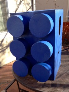 So, this morning after I dropped the boys at school, I got to work. An employee at Joann’s was emptying out a box of freight on the sales floor. From half a store away, it sure looked like exactly what I needed. I swooped closer, stealthily eyeing it from an aisle away and sizing it up before approaching the employee and asking if she’d be willing to give it to me. She did. First task completed and for free. After that, I was off to Michael’s for blue, satin-finish spray paint. My last stop was Hobby Lobby, where I found the round boxes I would need. Roughly $37 in supplies, and I was ready to assemble.