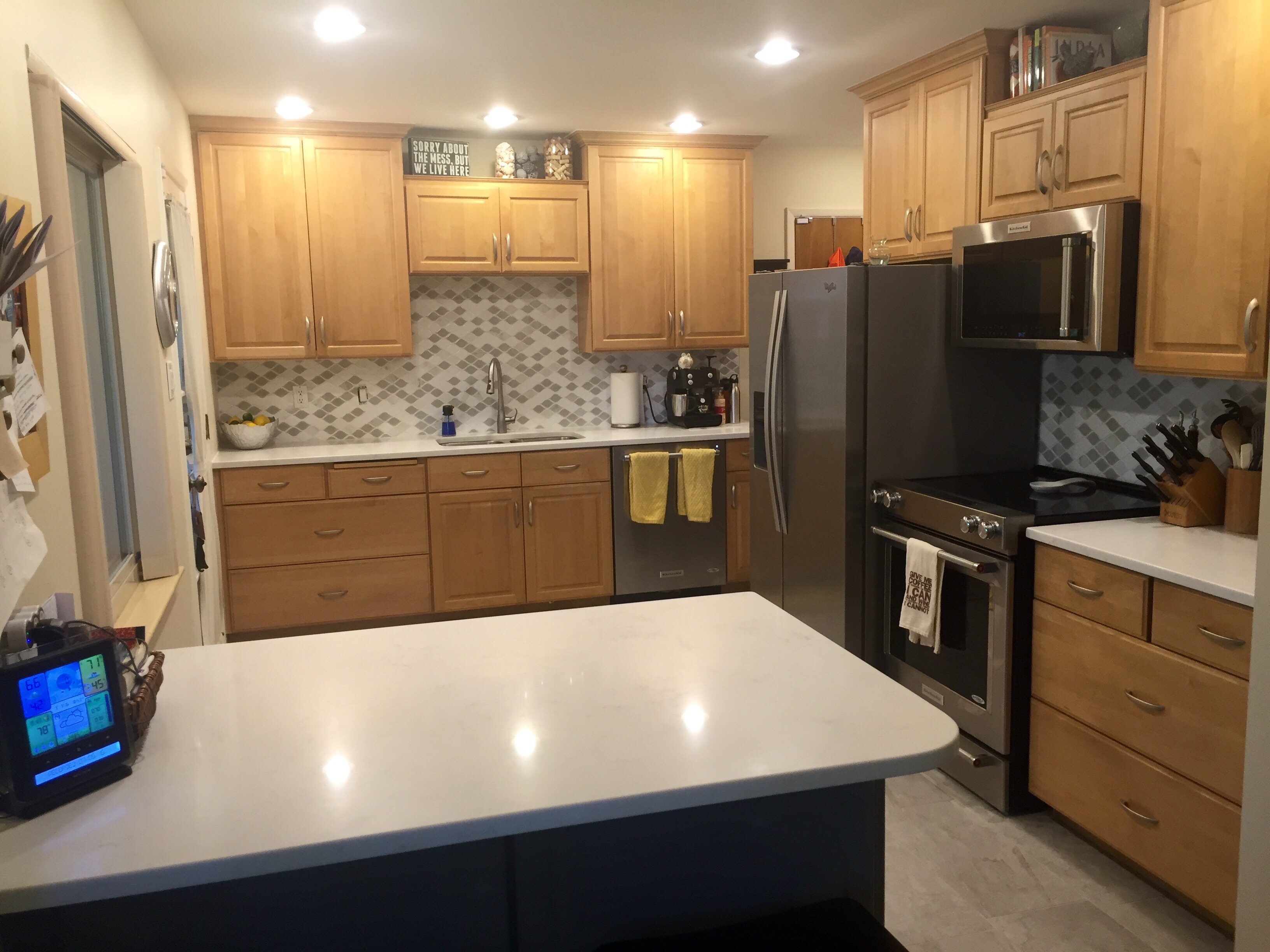We updated the kitchen by replacing the linoleum with grey floor tile and the formica with quartz countertops. We traded the white appliances for stainless ones and over one weekend installed a contemporary, arabesque-style backsplash to pull the space together.